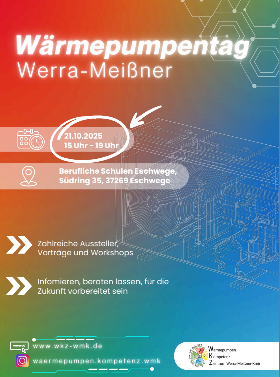 Am 21. Oktober 2025 findet an den Beruflichen Schulen Eschwege der Wärmepumpentag Werra-Meißner statt. Unter dem Motto „Informieren, beraten lassen, für die Zukunft vorbereitet sein“ dreht sich von 15:00 bis 19:00 Uhr alles rund um moderne Heiztechnologien und den nachhaltigen Einsatz von Wärmepumpen. Neben einer Vielzahl an Ausstellern aus der…